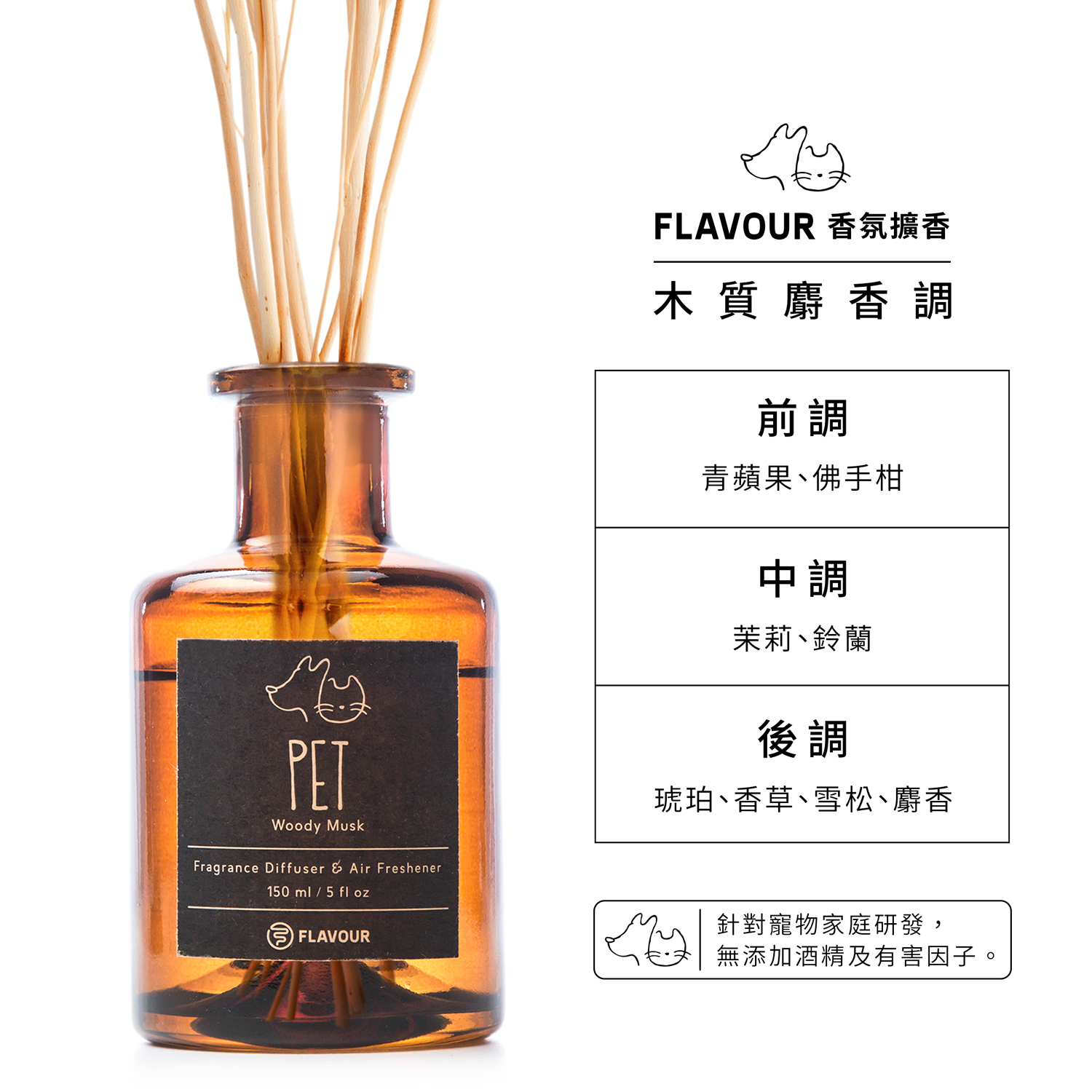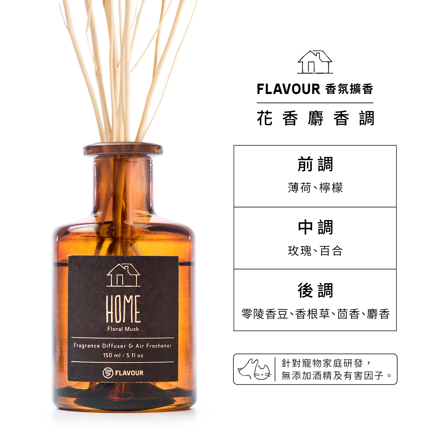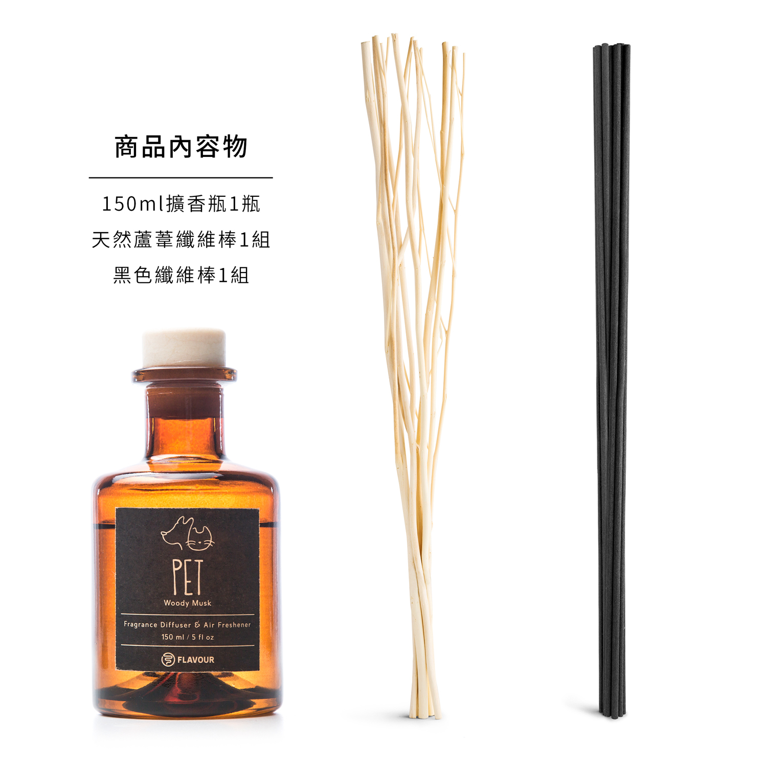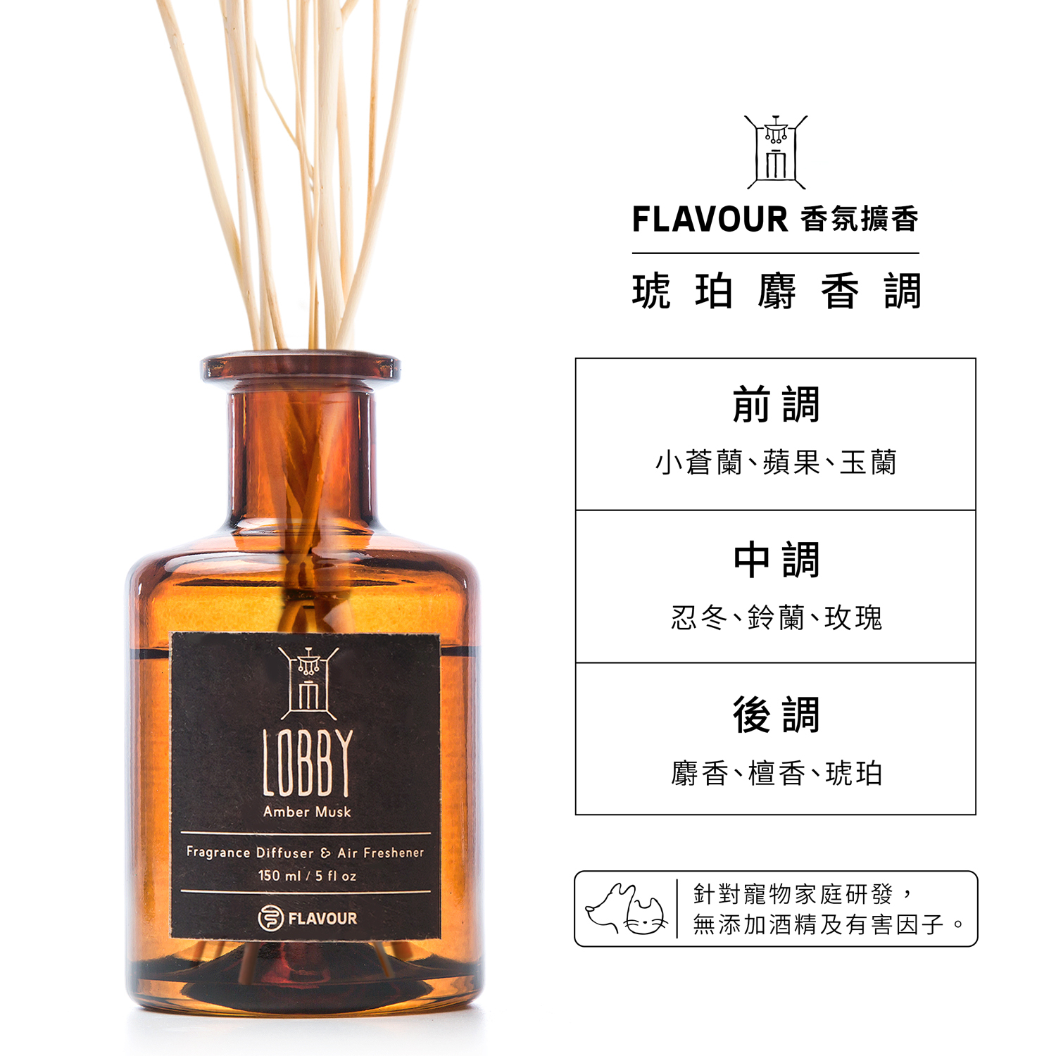 【FLAVOUR香氛擴香】商品描述:特別針對養寵物家庭專門研發的商品。採用無添加酒精及有害因子,兩種纖維棒可替換使用,轉換視覺氛圍;簡約的瓶身搭配時尚線條設計,彷彿沐浴在高貴奢華的享受之中。而植物萃取的精油更呈現清爽調性,味別:中調:茉莉、鈴蘭PET 香調:木質麝香調前調:青蘋果、佛手柑前調:薄荷、檸檬後調:琥珀、香草、雪松、麝香LOBBY 香調:琥珀麝香調HOME 香調:花香麝香調中調:玫瑰、百合後調:零陵香豆、香根草、茴香、麝香前調:小蒼蘭、蘋果、玉蘭中調:忍冬、鈴蘭、玫瑰後調:麝香、檀香、琥珀外盒尺寸:7.3 x 7.3 x 24 cm商品規格:內容物:擴香瓶1瓶+天然蘆葦纖維棒+黑色纖維棒成份:香精油、異鏈烷涇尺寸誤差值:因人工丈量,尺寸±3%內為正常範圍材質:擴香木纖花、玻璃瓶產地:泰國保存期限:3年容量:150ml3. 纖維棒需1~2天完全潤浸後,方可帶出香氛氣息。使用方式:1. 將玻璃瓶的軟木外蓋打開。2. 取出纖維棒放置玻璃瓶中。注意事項:3. 如誤觸眼睛或肌膚敏感處時請勿揉搓,並以大量清水清洗後儘速就醫。1. 勿置於高溫或潮濕處,避免陽光直射。2. 請勿置於高級傢俱或精緻質料附近以免留下油漬或損毀傢俱。6. 本產品內容標示與檢驗居符合歐盟標準規範。4. 請勿食用,如誤飲本產品時,請儘速就醫。5. 請遠離火源和易燃物旁邊,並置於小孩、寵物不易接觸到的地方。購買須知:3. 商品一經開封後,恕無法辦理退換貨。1. 情境圖片僅供參考,本商品內容不包含其他展示品。2. 商品圖檔顏色,因每台電腦螢幕設定不同有所差異,請以實際商品為主。