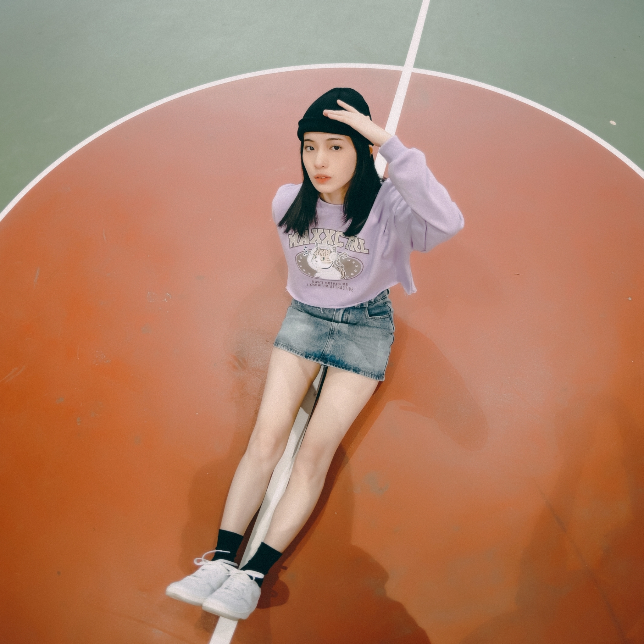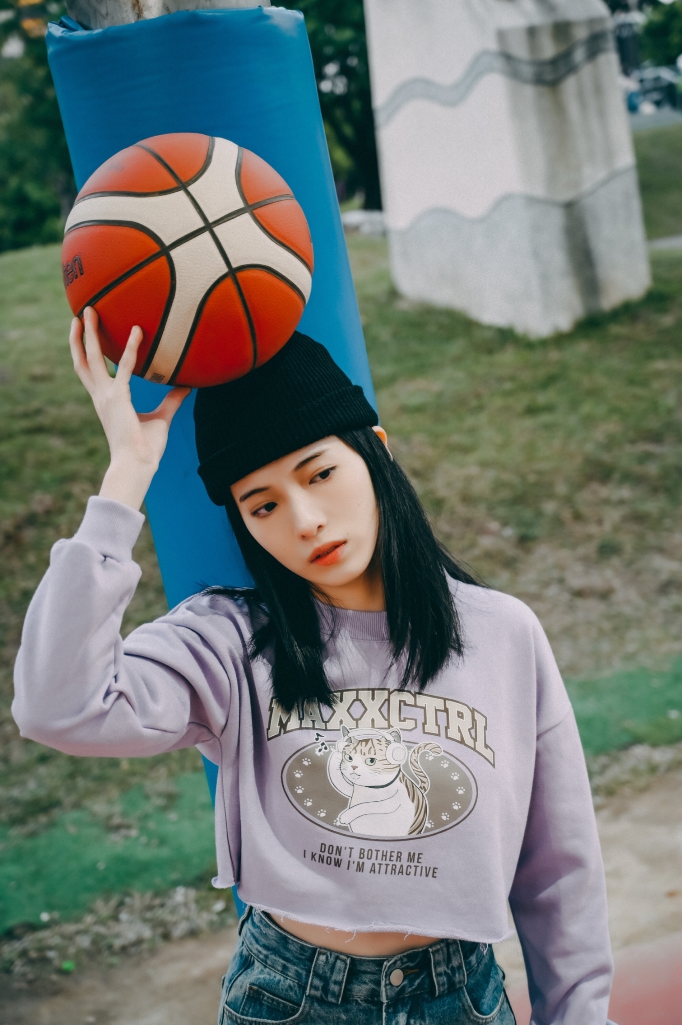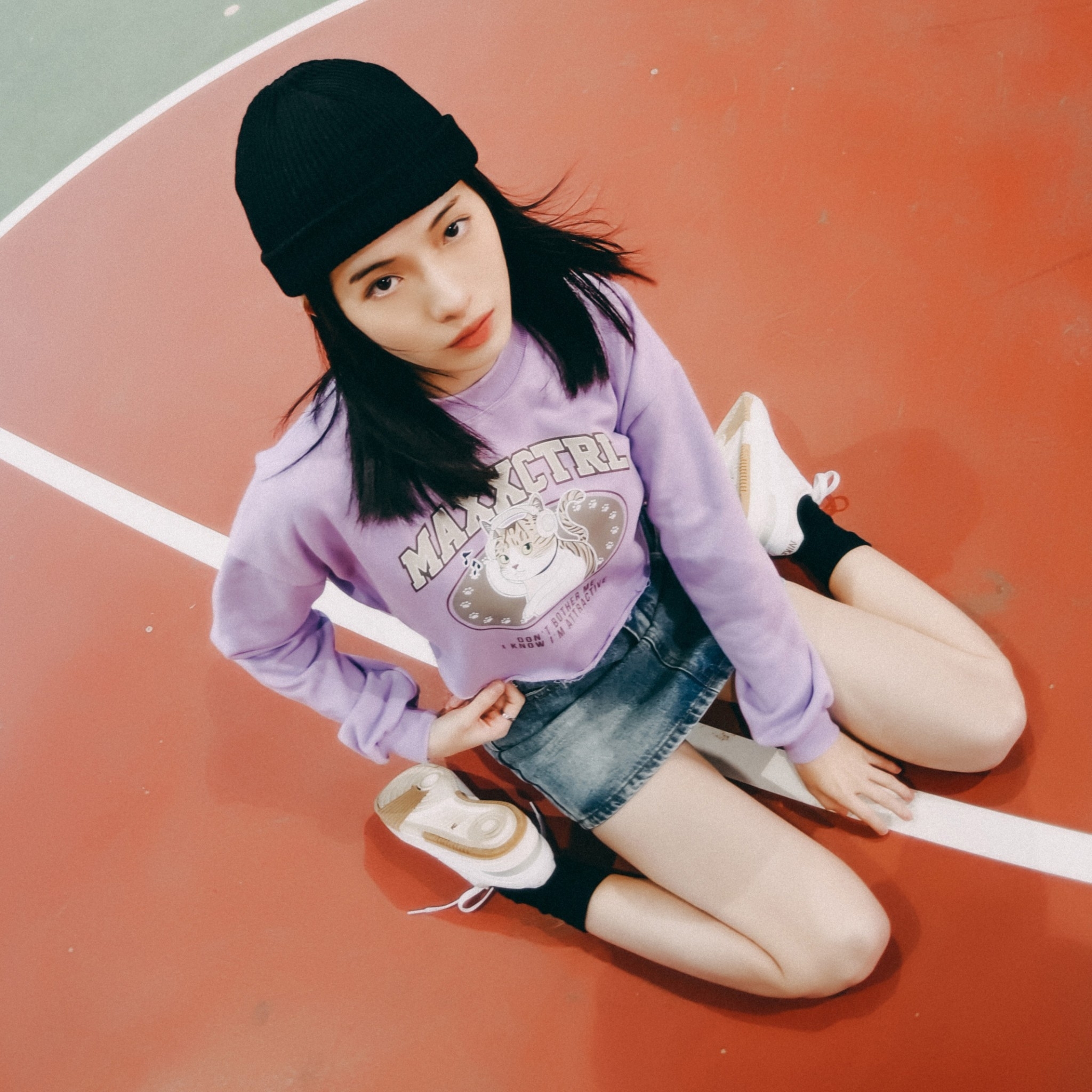MAXXC 戴耳機的貓短版大學T-粉紫